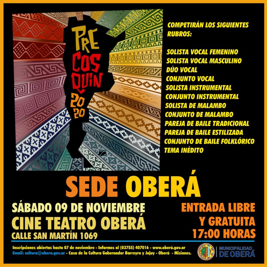 OBERÁ. Dado a que se esperan lluvias intensas para el sábado 9, la organización del certamen que busca a representantes de la Sede Oberá para el Precosquín, decidió el cambio de escenario para la participación, se realizará en el Cine Teatro (San Martín 1069), a partir de las 17.