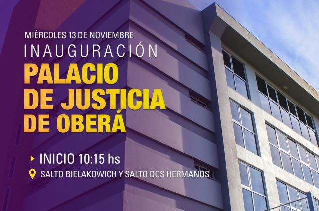 OBERÁ. Este miércoles 13 de noviembre, se realizará la inauguración del Palacio de Justicia de Oberá. Será a partir de las 10:15hs. Con la presencia del Gobernador de Misiones Lic. Hugo Passalacqua, el Intendente Dr. Carlos Fernández y otras autoridades.