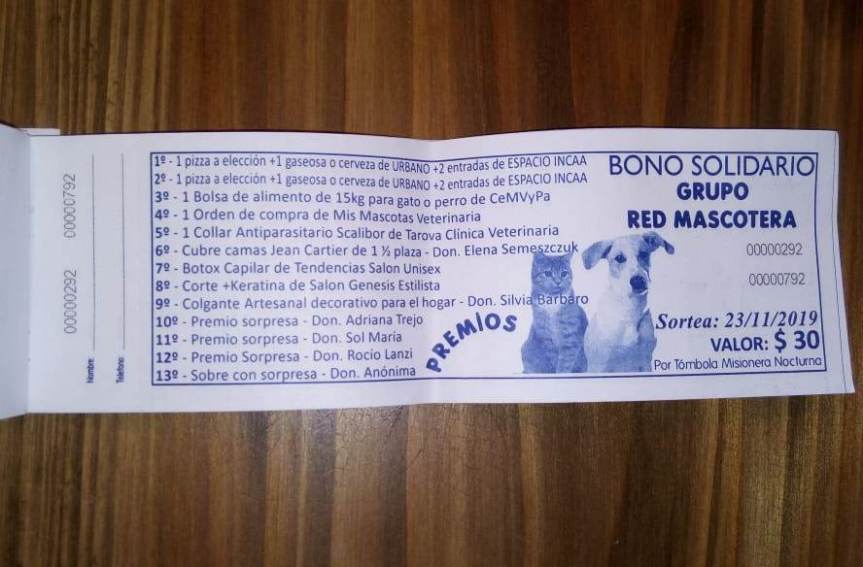 El mismo se puede adquirir en farmacia La Boticaria en calle 9 de Julio y Santa Fe o comunicarse en la página de Facebook Red Mascotera Oberá y sortea el 23 de este mes.