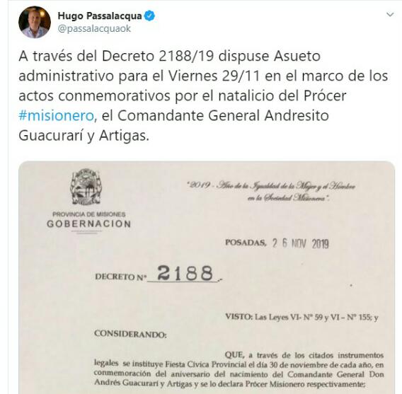 MISIONES. Es así que en conmemoración del Prócer misionero Comandante General Andrés Guacurarí y Artigas, el gobernador Hugo Passalacqua dispuso por Decreto 2188/19 que haya asueto para el próximo viernes 29 de noviembre en todo el territorio provincial. También lo anunció a través de sus redes sociales.