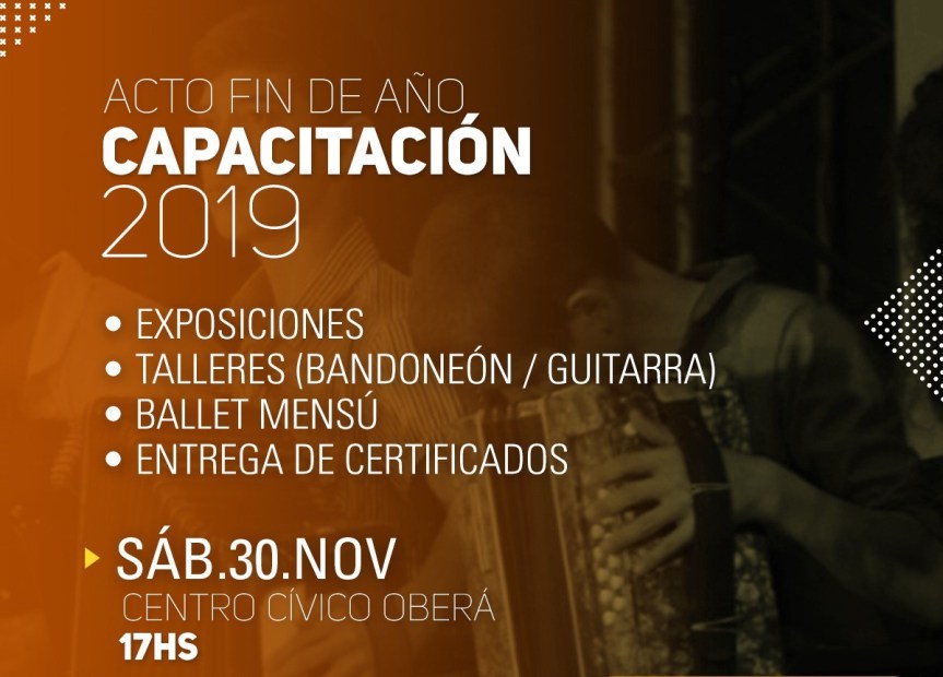 Será el cierre de todas las actividades de los talleres que se desarrollan en el Departamento de Capacitación de la Municipalidad. Además de las muestras de trabajos, actuarán los alumnos de los talleres de bandoneón y guitarra, como así también la actuación del ballet El Mensú.
