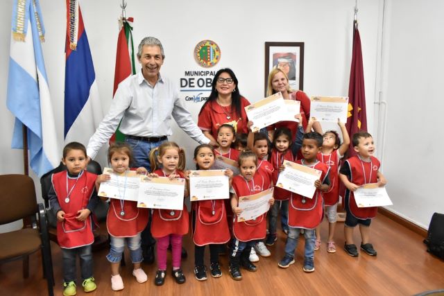 OBERÁ. El Intendente, Dr. Carlos Fernández recibió a los niños y niñas pertenecientes a la sala de 3 años de la escuela N°184 del Neni 2024 del barrio San Miguel luego de que ellos participaran de la Feria Nacional de Innovación Educativa con el proyecto “Radio los Bajitos”.