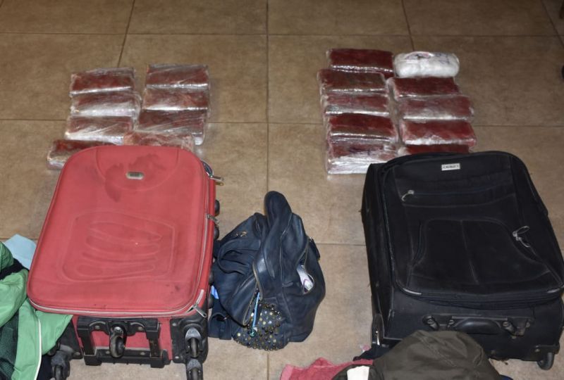 Seguidamente, ante testigos se procedió a la apertura de las valijas, constatando en su interior 17 paquetes rectangulares y otro ovalado que contenían una sustancia vegetal. Integrantes de Criminalística y Estudios Forenses, llevaron a cabo las pruebas de campo Narcotest, que arrojaron resultado positivo para «cannabis sativa». Un total de 13 kilos 659 gramos fue secuestrado.