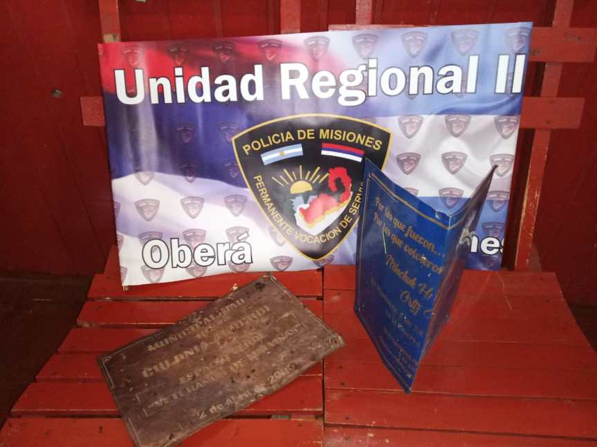 El primero de los ilícitos, se conoció el 20 de septiembre, cuando Roberto M., denunció que autores ignorados, sustrajeron de la Plazoleta Veteranos de Malvinas, dos placas metálicas. Inmediatamente, se montó un operativo de búsqueda de los elementos sustraídos. Fue esta mañana, que los uniformados realizaban patrullajes por caminos vecinales, donde hallaron los objetos escondidos entre las malezas.