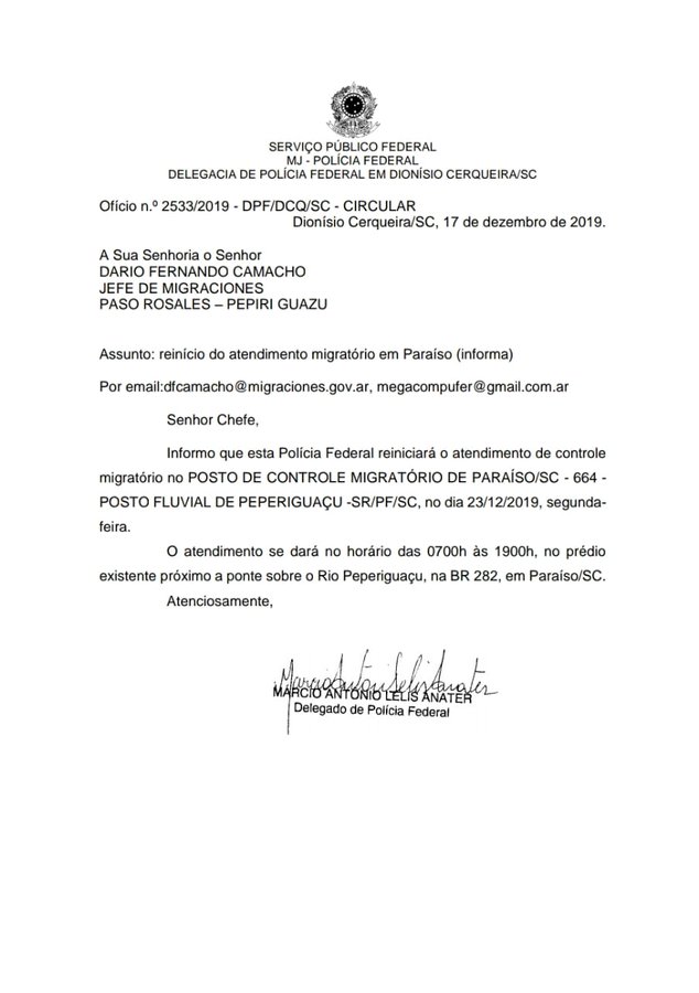 El comunicado fue emitido por el Jefe de la Policía Federal de Dionisio Cerqueira, Daniel Reschke, y detalló que trabajarán en el horario de 7 a 19hs.