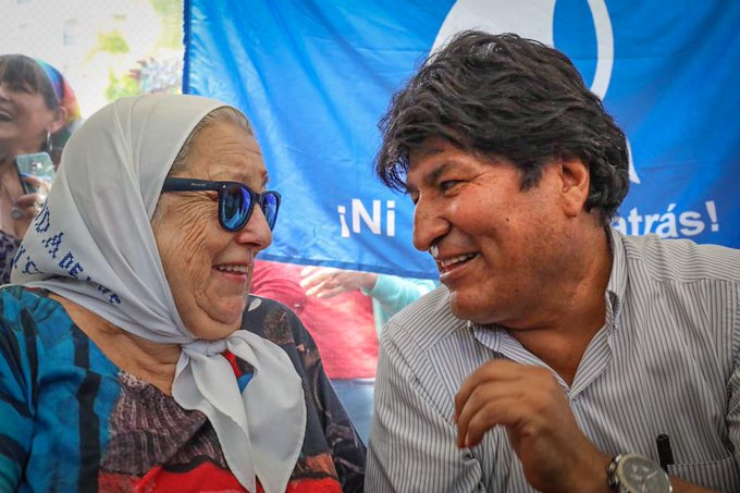 El exjefe de Estado de Bolivia fue recibido en la Pirámide de Mayo por Hebe de Bonafini, referente de las madres de jóvenes detenidos-desaparecidos por la última dictadura cívico-militar. «La Plaza no es marcha, no es cholulismo ni venir a sacarse fotos. Evo nos necesita. Bolivia está sufriendo. Ese golpe maldito de Estados Unidos al pueblo boliviano, no es solo a ellos, lo hicieron acá, en Venezuela, nosotros también estamos afectados», sostuvo la dirigente.