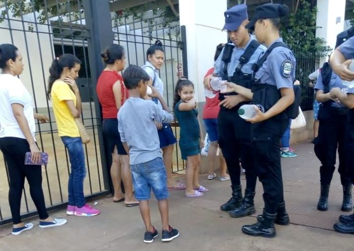 Al igual que en la jornada del jueves y en el marco de las múltiples actividades que desarrolla la Policía en Oberá; efectivos policiales de la división Prevención de Delitos y cadetes del Instituto Universitario de la Policía, quienes brindan colaboración en las tareas de prevención en estas fechas, con motivo de las fiestas de fin de año; ofrecieron además hidratación a las personas que bajo el intenso calor hacen fila estos días en los distintos cajeros de la ciudad, en las cuales se hallan, niños, mujeres embarazadas y personas mayores, brindándoles agua para mitigar las altas temperaturas.