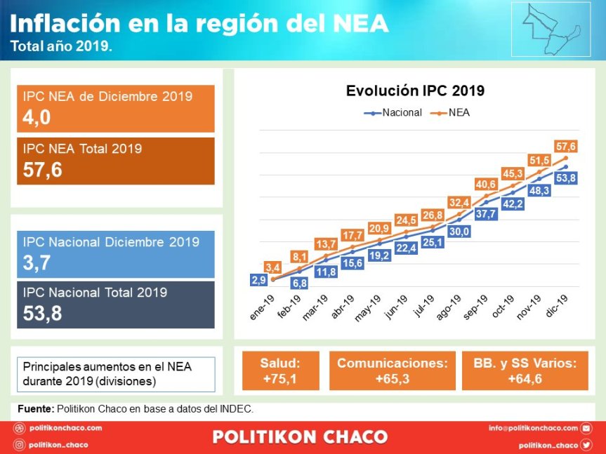 NEA. Luego de haber tenido un incremento de precios del 4% en diciembre, la región del NEA culminó el año 2019 con un alza total del 57,6%, siendo así la más alta de todo el país, según un informe de la consultora Politikon Chaco.