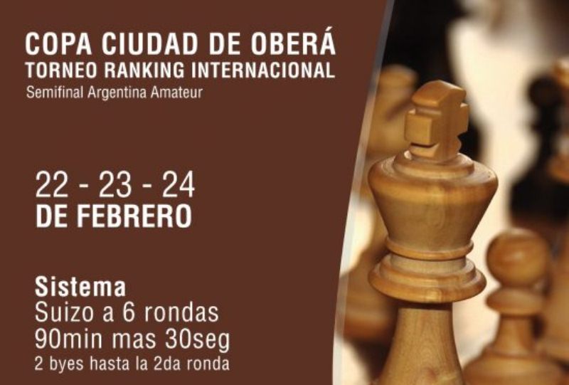 OBERÁ. La Asociación Civil Club de Ajedrez de Oberá y la Federación Argentina de Ajedrez invitan a la Semifinal Argentina Amateur, valido dentro de los torneos IRT (International Rating Tournament). Se disputará en el Complejo Polideportivo los días 22, 23 y 24 de febrero.