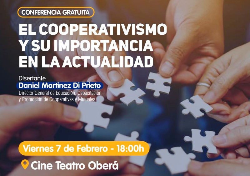 OBERÁ. Este viernes 18, en el Cine Teatro Oberá, tendrá lugar una conferencia: “Las Cooperativas en la actualidad; desafíos y oportunidades”. Se invita a todos los interesados en la temática, que participen del mismo. El horario de inicio está fijado a las 18hs.
