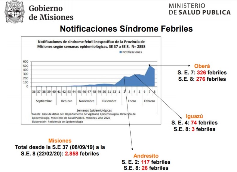 Según un informe del Ministerio de Salud de la provincia, conducido por Oscar Alarcón, la situación epidemiológica arroja 2858 casos sospechosos en Misiones, y solo 162 confirmados por laboratorio. Este número se divide en Oberá 19, Andresito 43, Posadas 24, Iguazú 39, Eldorado 8 y Garupá 17.