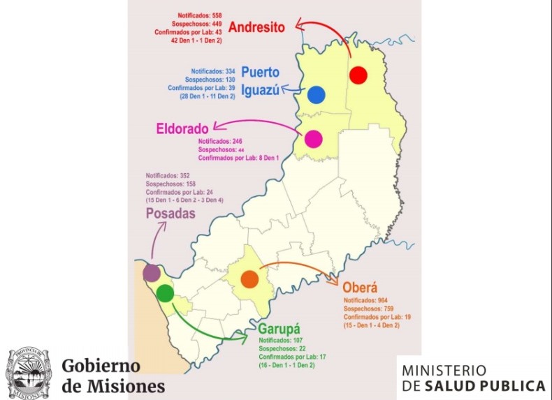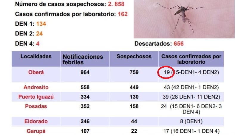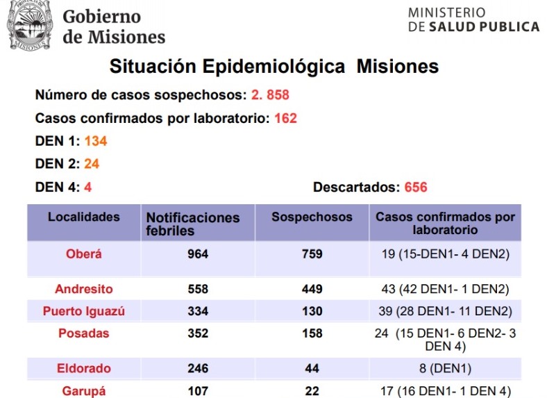 Según un informe del Ministerio de Salud de la provincia, conducido por Oscar Alarcón, la situación epidemiológica arroja 2858 casos sospechosos en Misiones, y solo 162 confirmados por laboratorio. Este número se divide en Oberá 19, Andresito 43, Posadas 24, Iguazú 39, Eldorado 8 y Garupá 17.