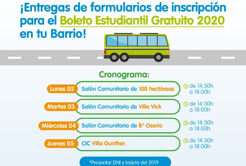 OBERÁ. Toda esta semana se cumplirá con un cronograma que recorrerá algunos barrios de la ciudad, realizando las inscripciones al Boleto Estudiantil Gratuito (BEG). Será por la tarde de 14.30 a 18hs