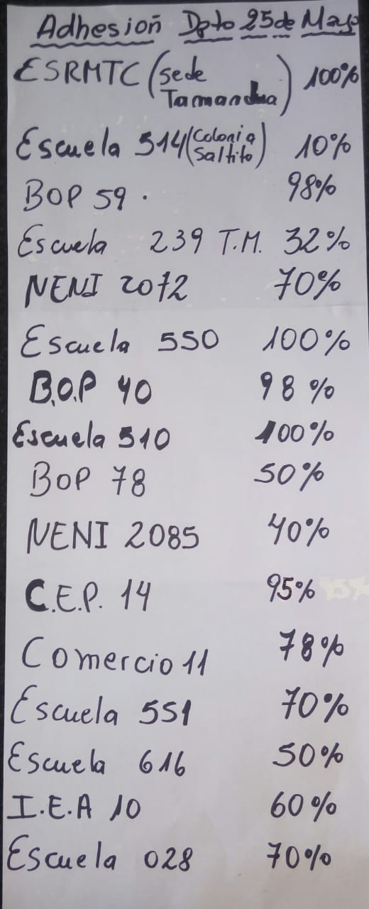 En cuanto al porcentaje de adheridos al paro, Ramirez estimó que superó el 90%, mencionando que «la escuela 304, EPET, Amadeo Bondplan, la 660 y la Comercio 100 % cerrados». Agregó que el «Polivalente 80%, 305 del total están trabajando 3 docentes, 237 el 22%, la escuela del Krause hay 6 que están trabajando, y así». En cuanto a Panambí, una escuela estaba cerrada, y en la otra fueron a trabajar solo 2. En Guaraní, «el BOP cerrado totalmente», dijo.