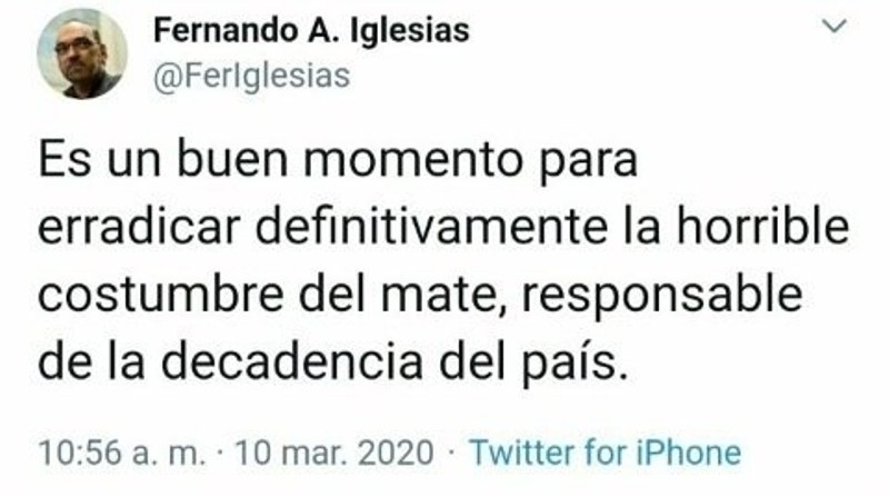 Sostuvo en sus redes sociales: “Es un buen momento para erradicar definitivamente la horrible costumbre del mate, responsable de la decadencia del país”.