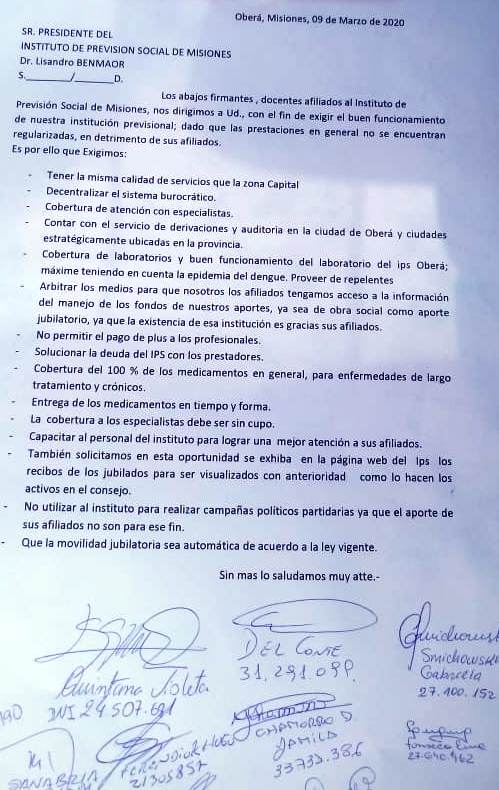 Los docentes exigen «el buen funcionamiento de nuestra institución previosional dado que las prestaciones en general no se encuentran regularizadas», dice el petitorio que detalla: tener la misma calidad de servicios que en Posadas; descentralizar el sistema burocrático; cobertura de atención con especialistas, contar con el servicio de derivaciones y auditoría en Oberá y ciudades estratégicas. Además piden coberturas de laboratorios del IPS; no permitir el cobro de plus y cobertura del 100 % de los medicamentos, repelentes, entre otros pedidos.