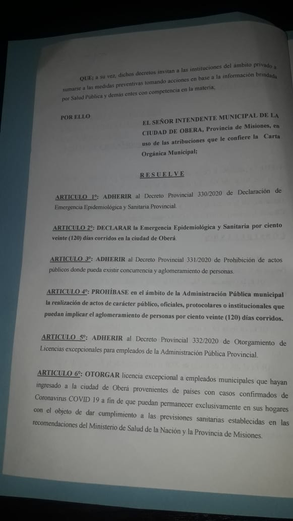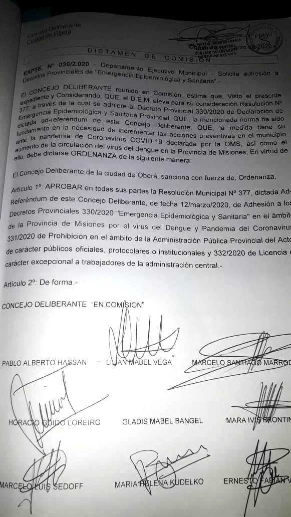 OBERÁ. En la Primer Sesión Especial del año, este viernes 13, los ediles aprobaron la solicitud del Ejecutivo Municipal de adherir en todas sus partes la Resolución Municipal Nº 377, dictada Ad-Referéndum del Legislativo, de fecha 12 de marzo del 2020, de Adhesión a los Decretos Provinciales 330/2020 «Emergencia Epidemiológica y Sanitaria» en el ámbito de la Provincia de Misiones por el virus del Dengue y Pandemia del Coronavirus; 331/2020 de Prohibición en el ámbito de la Administración Pública Provincial del Actos de carácter públicos oficiales, protocolares o institucionales y 332/2020 de Licencia de carácter excepcional a trabajadores de la administración central.