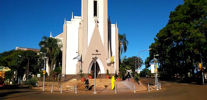 OBERÁ. Dotaciones de bomberos de la Policía de Misiones continuaron durante esta jornada con operativos sanitarios contra el COVID 19, a lo largo de toda la Provincia, con tareas de limpieza y desinfección en lugares públicos, sobre todo en zonas de bancos, cajeros automáticos, plazas, centros de salud y paradas de colectivos.