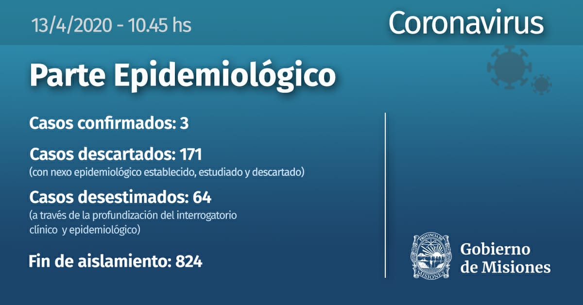 El Ministerio de Salud Pública de Misiones informó este lunes a través de un comunicado oficial que continúan siendo tres los casos positivos de coronavirus en la provincia.