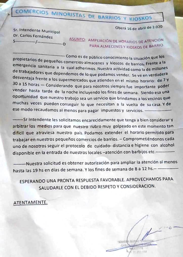 OBERÁ. Un grupo de comerciantes minoristas que poseen comercios de barrio, ya sean despensas, maxikioscos, kioscos, y a fines presentó una nota en la municipalidad pidiendo al intendente Carlos Fernández que se extienda el horario comercial hoy limitado hasta las 15 horas.