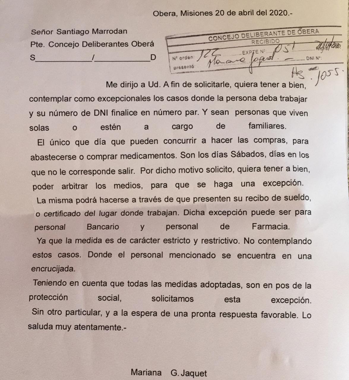 OBERÁ. Con fecha de este 20 de abril y dirigida al presidente del Concejo Deliberante, Santiago Marrodán, la dirigente radical Mariana Jaquet, solicitó se implementen excepciones a las personas que deben trabajar durante la semana y la restricción de circular según número de DNI le complican el abastecimiento.
