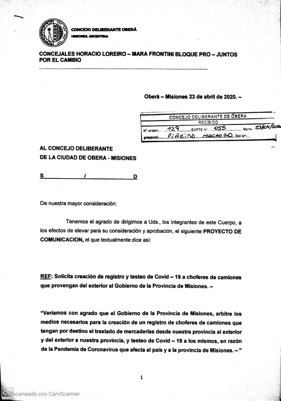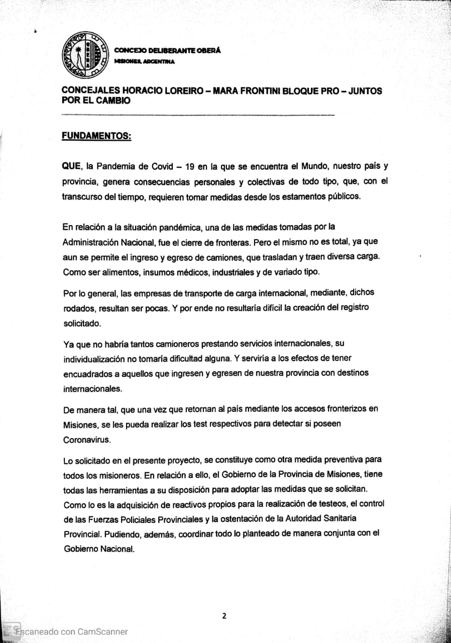 OBERÁ. En el marco de la prevención y lucha contra el Covid – 19, los concejales del interbloque PRO/ Juntos por el Cambio de Oberá, Horacio Loreiro y Mara Frontini proponen el control estricto a todos los camiones que ingresen de países limítrofes a la provincia, mediante la creación de registro y testeos a todos los choferes que provengan del exterior.