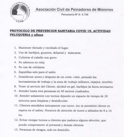 En el caso de las peluquerías y a fines, el protocolo exige mantener aireado y ventilado el local, usar barbijos, guantes, delantal y máscaras. Además cubrirse el cabello con gorro, no usar adornos, relojes ni celulares. La normativa obliga a la desinfección entre un corte y otro, además de atender hasta 3 personas en 40 metros cuadrados y un espacio de 20 minutos entre un cliente y otro.