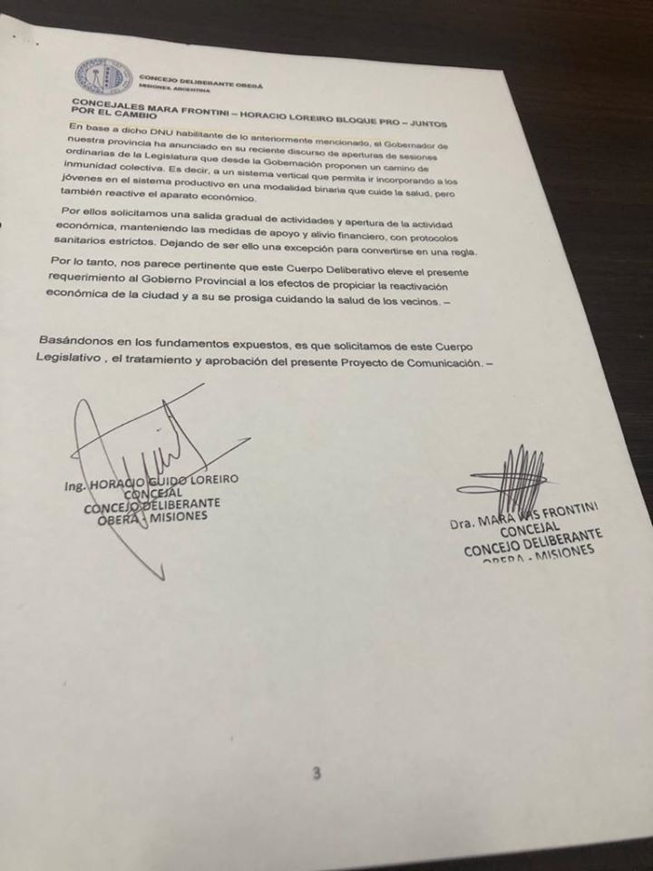 OBERÁ. El jueves se presentó un proyecto de comunicación de los concejales Horacio Loreiro y Mara Frontini del Bloque PRO – Juntos por el Cambio de Oberá, solicitando al municipio ampliar desde el lunes 10 de mayo los días y horarios de los comercios autorizados, a fin de evitar aglomeraciones y beneficiar a los consumidores.