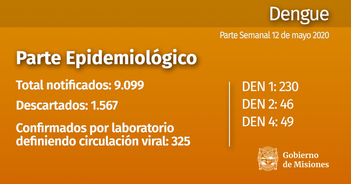 MISIONES. Según informó el Ministerio de Salud Pública de Misiones en su parte epidemiológico, emitido este martes. hay 9.099 casos con diagnóstico de dengue (sin análisis hecho), 1.567 casos descartados y 325 confirmados por laboratorio con estudio PCR que se realiza solo en Posadas y a un porcentaje de casos para seguimiento epidemiológico.