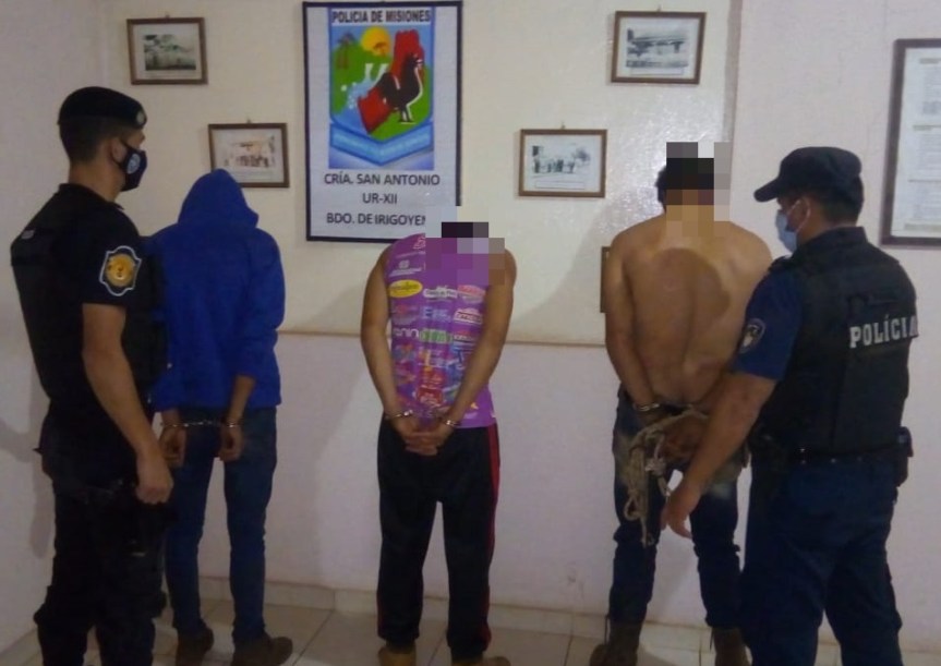 SAN ANTONIO. Efectivos de la comisaría de San Antonio a las 22:30 horas de ayer jueves, fueron requeridos en un inmueble del paraje Barbacuá por un hecho de robo. Una vez en el lugar Juan D.A, manifestó que minutos antes, los tres sujetos ahora detenidos se presentaron en su casa y tras amenazarlo con un machete, ingresaron y se robaron un bolso de cuero y una llave.