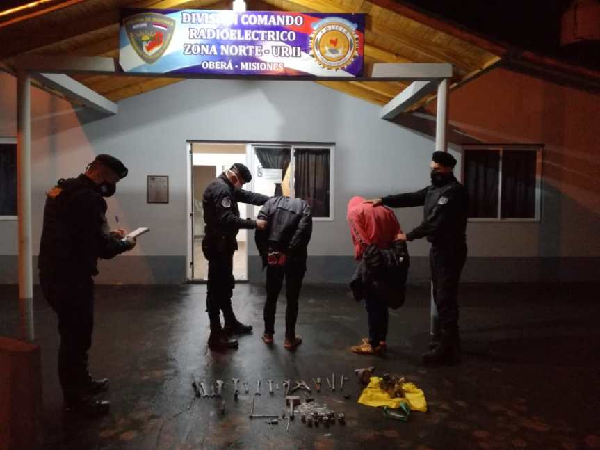 OBERÁ. Mediante un rápido accionar, hoy, a las 5:55, efectivos del Comando Radioeléctrico Zona Norte, recuperaron varias herramientas, entre ellos, llaves, destornilladores, una masa, además de un soplete para pintar y una bomba de aceite de automóvil. Asimismo, detuvieron a Luis O. de 39 años y a Lucas A. de 19.
