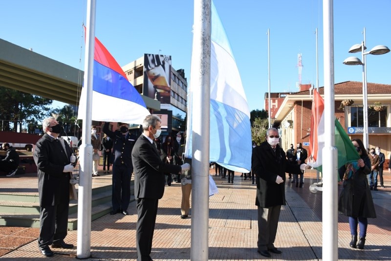 Previo a las palabras alusivas, se entonó el Himno Nacional y a su vez se izaron las banderas de Argentina, Misiones y Oberá. Quienes cumplieron con esta acción fueron, el Dr. Fernández y el Cdte. Ppal. Marco Antonio Duette(Jefe del Escuadrón N°9 de Gendarmería Nacional) del Pabellón Argentino; Marrodán y el Crio Inspector Juan Rafael Kubiszen (Jefe de la URII de Policía) a cargo de la bandera de la provincia y el Dr. Francisco Aguirre (Pte. Del Tribunal Oral Penal) y la Patricia Nittman (Defensora del Pueblo) quienes se encargaron de la bandera de la ciudad.