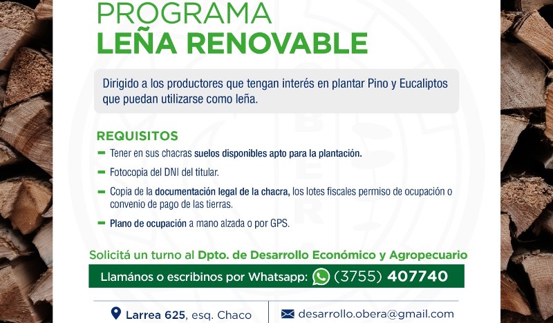 OBERÁ. El mismo está dirigido a productores interesados en plantar pino y eucaliptos que luego serán utilizados como leña. Deberán solicitar turnos con el Departamento de Desarrollo Económico y Agropecuario vía WhatsApp: 03755-407740.