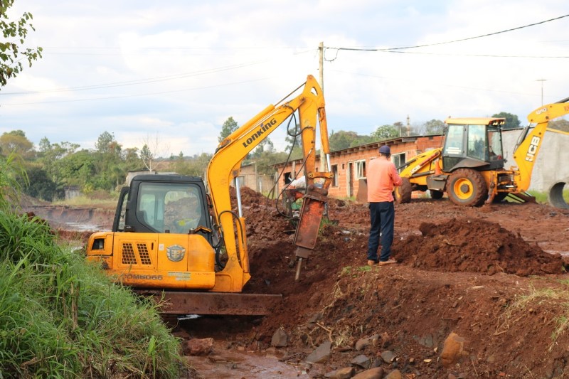 OBERÁ. Agentes de la dirección Obras y Servicios Públicos, instalan tubos pluviales en calle Oran del Barrio Villa Marttos.