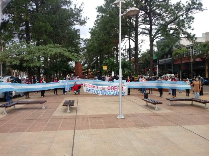 OBERÁ. En la mañana de este lunes, docentes autoconvocados, de UTEM y Tribuna Docente, se congregaron en la plazoleta Güemes desde las 8.30 para realizar una asamblea con importante participación de docentes. Fue con el fin de planificar y acordar medidas de fuerza para exigir el incremento salarial al básico de 12.800 pesos.