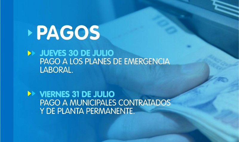 OBERÁ. Mañana jueves 30 de julio estará acreditado el pago del salario a trabajadores enmarcados en el Plan de Emergencia Laboral. En tanto que el viernes 31 será el turno de los contratados y de planta permanente.
