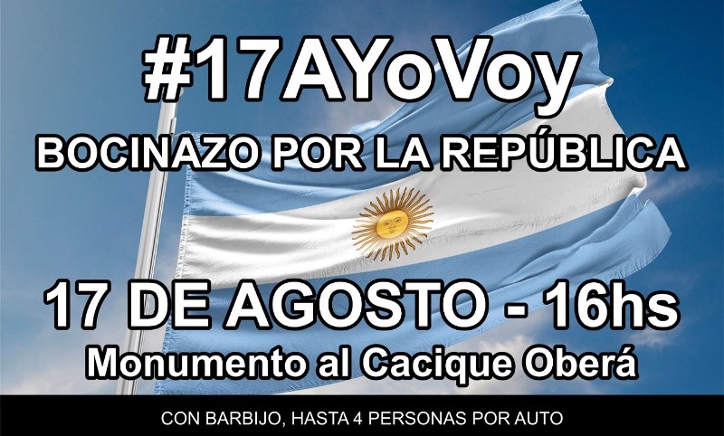 La convocatoria bajo la modalidad de «bocinazo» es para las 16 horas en avenida de las Américas y Gendarmería nacional, frente al monumento del Cacique Oberá. Aclaran que deberá usarse barbijo y no podrán ir más de 4 personas por auto.