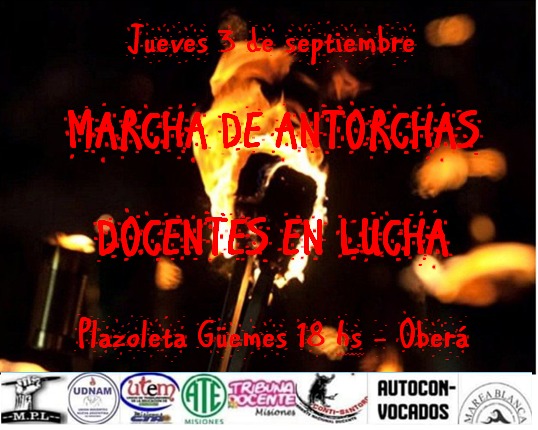 «Volvemos a la ruta, ante el silencio del gobierno, ante la traición de los sindicatos afines al poder, ante el silencio de muchos y la persecución de supervisores y directores que llaman a reuniones para que nuestros compañeros no salgan a la calle», señaló Leandro Sanchez, titular de UTEM respecto a las presiones que reciben los docentes no alineados con el gobierno en su reclamo de recomposición salarial. Anticipó que este jueves se concentrarán en la plazoleta Güemes para realizar una marcha de antorchas.