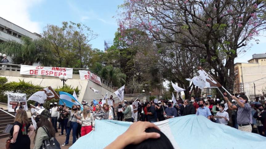 En horas del mediodía de este martes, los trabajadores del poder judicial hacen una manifestación frente al Palacio de Justicia de Posadas reclamando mejoras salariales.
