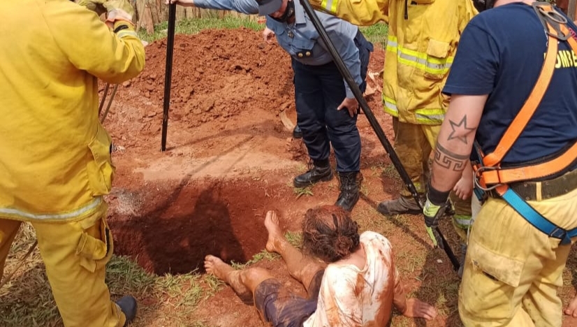 Fue un trabajo en conjunto que realizaron en el barrio Olería, el personal policial de Campo Grande y de Bomberos Voluntarios, para rescatar a Juan O. de 43 años, quien cayó a un pozo de agua de al menos 10 metros de profundidad. A raíz de la caída resultó con un traumatismo de rodilla derecha.
