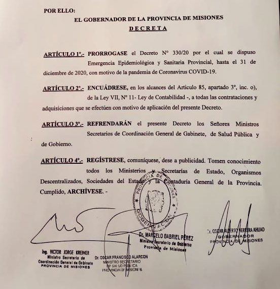 Fue mediante el Decreto 330/20 firmado por el Gobernador y los ministros de Coordinación General de Gabinete, de Salud Pública y de Gobierno; Víctor Kreimer, Oscar Alarcón y Marcelo Pérez, respectivamente.