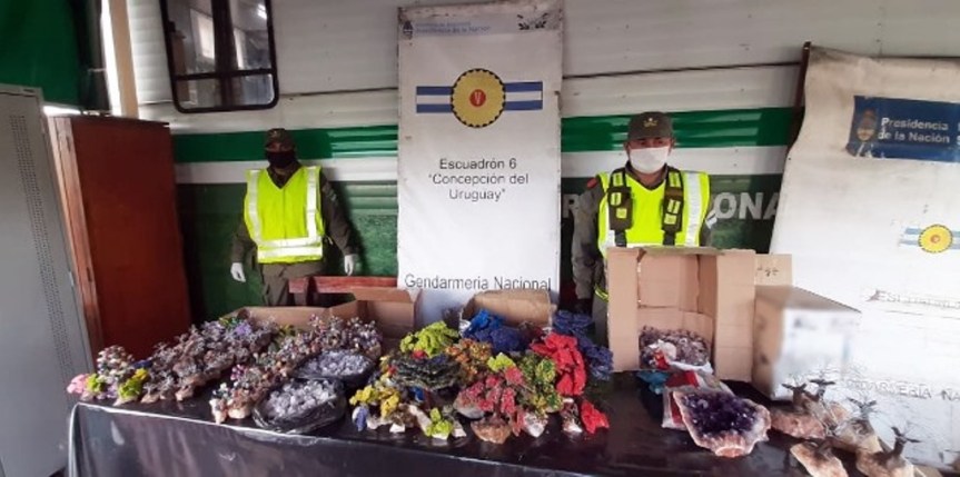 Al inspeccionar cinco bultos que alertaron a los gendarmes por su peso y dimensiones, se constató que contenían diversas piedras semipreciosas (amatistas, geodas , geodas diamantistas, geodas de falso citrino Y cristales diamantistas).