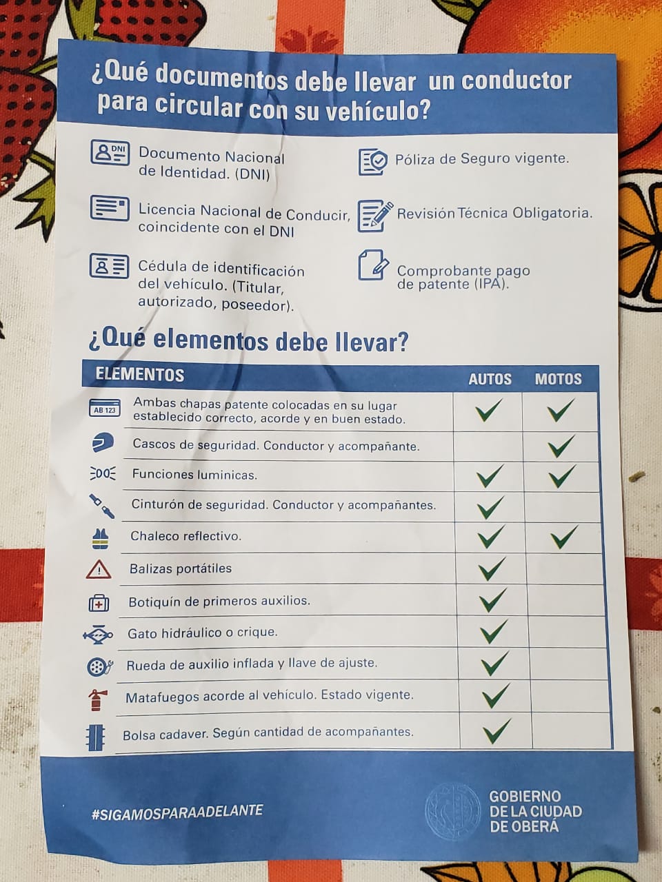 En Oberá, por su parte, los inspectores de tránsito entregaron un folleto impreso por la Municipalidad dirigido a los conductores con las exigencias para circular. Entre estas piden bolsa para cadáveres según la cantidad de personas dentro del vehículo y chalecos reflectivos tanto para autos como para las motos, entre otras.