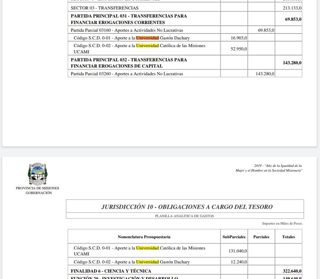 Como se mencionó al principio de este informe, la Universidad Católica de las Misiones (UCAMI) percibe cerca de 200 millones de pesos al año, contemplados por el Presupuesto General de la Provincia.
