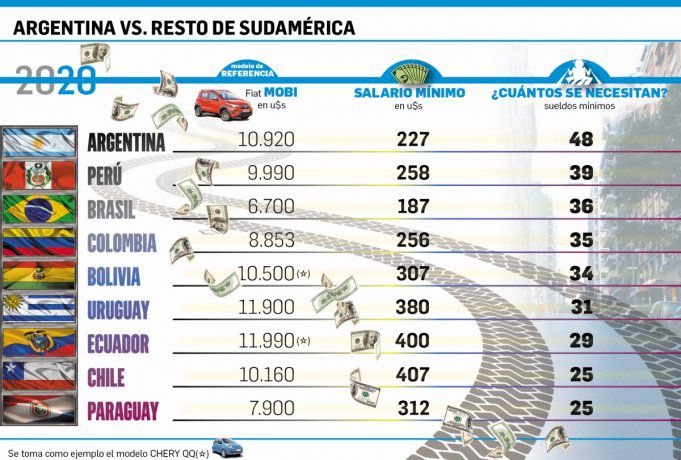 Esos 48 sueldos que se requieren para comprar este modelo duplican, prácticamente, los que se necesitan para hacerlo en Chile o Paraguay, que sólo demandan 25 salarios mínimos. Estos son los países mejor posicionados en este ranking en la región. Muy cerca, con 29 y 31, se ubican Ecuador y Uruguay, que es el país que suele tener los autos más caros de Sudamérica (y también los ingresos más altos medidos en dólares). El resto de Sudamérica marcha atrás en un pelotón de entre 34 y 39 meses. No se toma en cuenta los que sucede en Venezuela por razones más que obvias. Hay dos países para los que es necesario explicar un detalle: Ecuador y Bolivia. Al no comercializar Fiat su modelo Mobi, en esos mercados, se buscó un vehículo del mismo rango de precios, como el Chery QQ, para hacer la comparación.