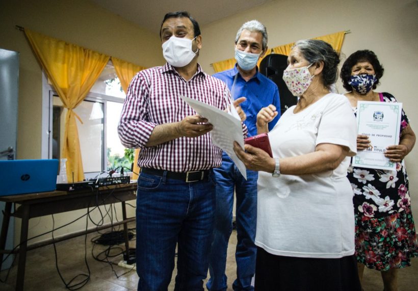 En la ocasión, respetando las medidas de bioseguridad, el Gobernador realizó la entrega simbólica a tres familias beneficiadas, a quienes les agradeció la oportunidad de poder compartir con ellos la alegría de obtener el título de su propiedad. “Sabemos lo que es para la familia tratar de conseguir su título de propiedad, a veces no se pueden tener los derechos a muchas oportunidades igualitarias sino se tiene el título de propiedad. Por eso creo que este papel, que parece muy sencillo, tiene la importancia de un documento como el DNI. Porque con el título de propiedad podes tener luz, agua, podés gestionar planes, programas. Detrás de todo esto hay mucha dignidad, detrás de este papel, que a veces la burocracia lo hace tan difícil, hay dignidad e igualdad de oportunidades”, insistió.
