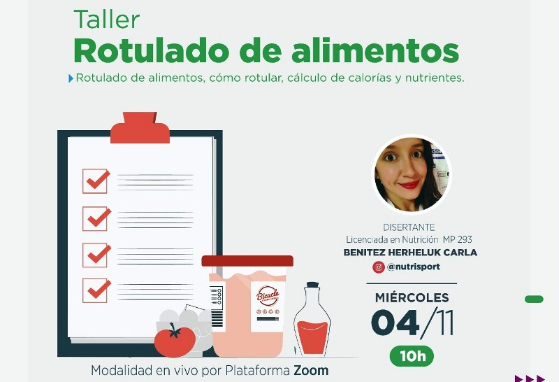 Este taller estará a cargo de la Lic. en Nutrición, Benítez Herheluk Carla Antonella. El objetivo principal es que el emprendedor que trabaja con alimentos conozca sobre el rotulado de los mismos y adquiera las herramientas para poder realizarlos ellos mismos.