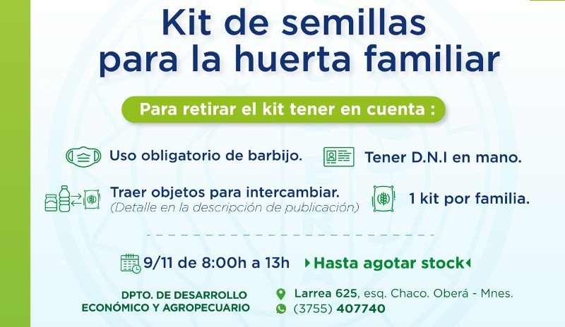 Se llevará adelante una nueva entrega de kits de semillas, pero con una modalidad particular, en esta oportunidad será mediante un intercambio. Cada grupo familiar deberá traer botellas plásticas vacías, frascos de vidrio, pilas en desuso, tapitas plásticas o plantines de árboles frutales. Todo lo que se traiga para intercambiar debe estar limpio y en buenas condiciones.