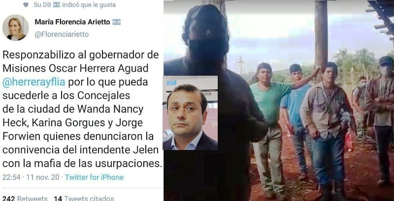 María Florencia Arietto, abogada penalista y exasesora del Ministerio de Seguridad durante el gobierno de Mauricio Macri, lanzó una advertencia al gobernador de Misiones Oscar Herrera Aguad «por lo que pueda sucederle a los Concejales de la ciudad de Wanda Nancy Heck, Karina Gorgues y Jorge Forwien quienes denunciaron la connivencia del intendente Jelen con la mafia de las usurpaciones».