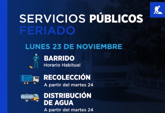 El próximo lunes no habrá servicios públicos por el Día de la Soberanía Nacional que se conmemora hoy. Ante esa situación advirtieron desde el Ejecutivo municipal que se mantendrá normal el barrido y limpieza.
